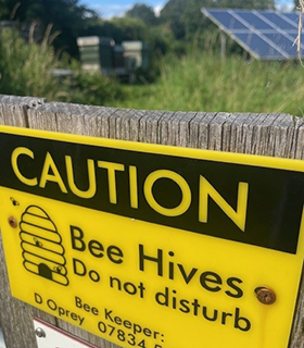 Besides the arrays, there are domestic bee hives, grasses and wildflowers. A fruit hedge was planted along the south-east side of the array when it was first installed, and a few fruiting trees behind it.