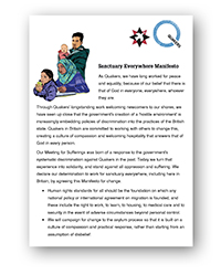 'Britain can be a hostile place for people from migrant and refugee backgrounds. This publication has been created to help Quakers articulate a vision of how nations can transition from that hostility to a culture of sanctuary everywhere. The political context is always changing, but the values in which Quakers root our action are constant. We want to help build a society that responds to the inherent worth of each person, expressing our belief in “that of God in every one"...'