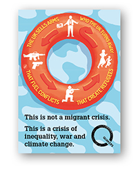 We have downloadable and physical copies of our 'This is not a migrant crisis; This is a crisis of inequality, war and climate change' available as posters and postcards.